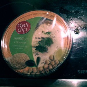 1 Tasse mit Grünzeug, über die ich wohl zuviel des Balsams geleert habe – denn der sah zwar aus wie Motoröl, schmeckte aber wie Essig.