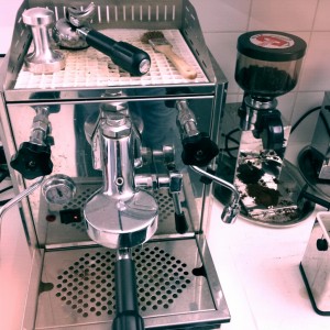 Jetzt ergibt alles einen Sinn! Man nimmt dieses Ding… was weiß ich, wie das heißt… diese Halterung herunter, hält sie unter die Kaffeemühle (rechts im Bild) und lässt sich nach Belieben frischen Kaffee reinbröseln. Danach zurück auf die Kaffeemaschine… äh geschnallt und den äh… Krafthebel daneben nach unten. Wenn genug Kaffee im Häferl, Hebel zurück und die Sache ist erledigt. Der Kaffee schmeckt genauso wie die Maschine aussieht: nach Metall und Dampf… nach Steampunk. Geil.